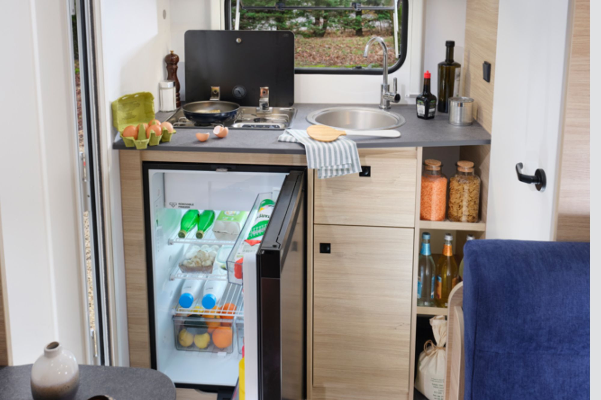 Disfruta de una auténtica cama central, amplia y de fácil acceso, ideal para el descanso diario. Su cocina trasera, práctica y bien distribuida, te permite cocinar cómodamente en cada parada.