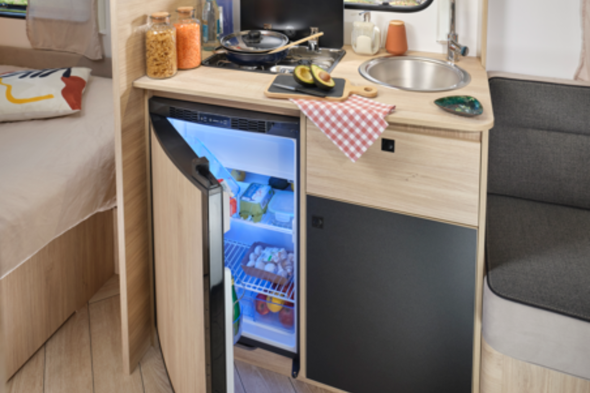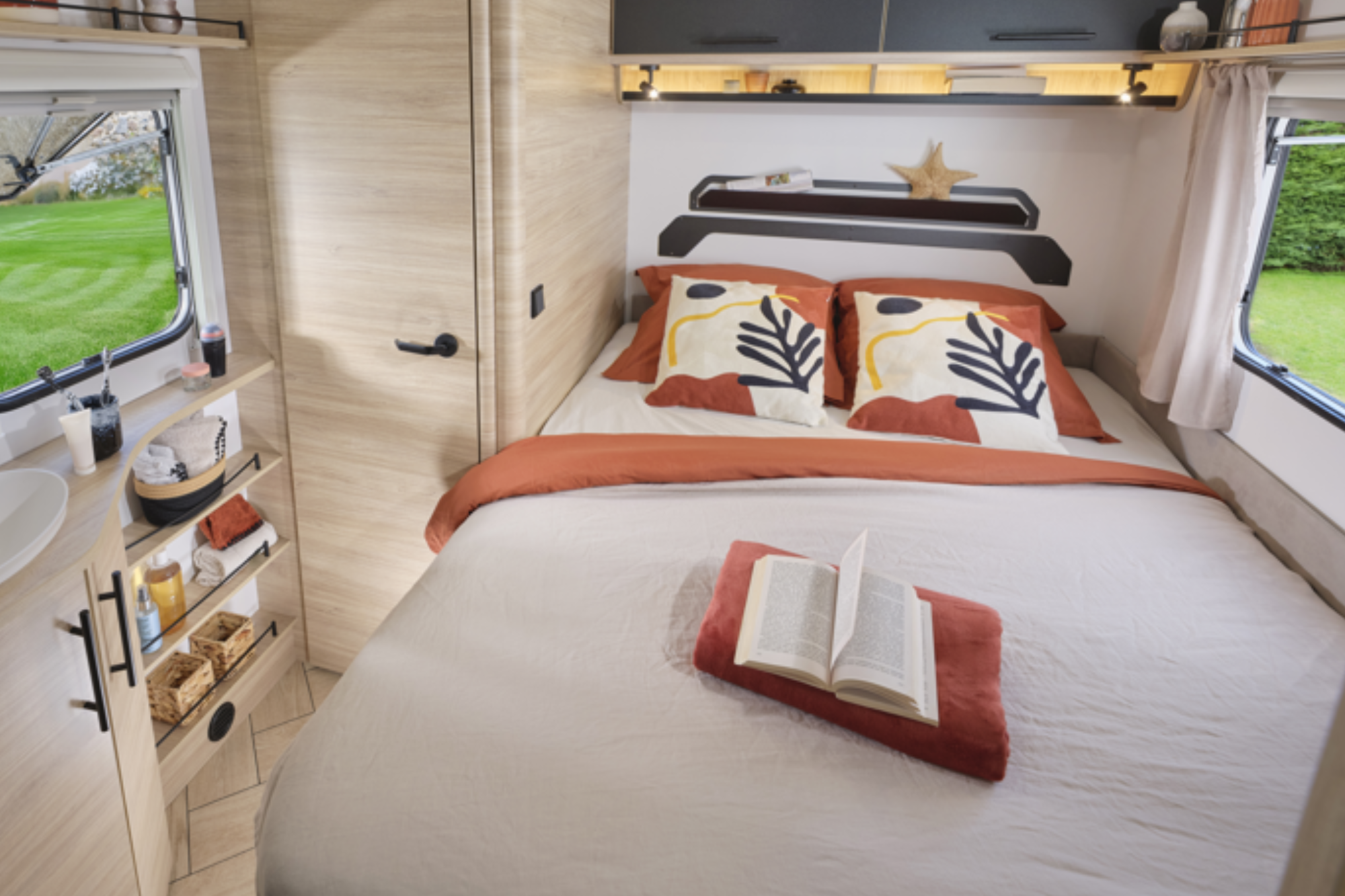 Disfruta de una auténtica cama central, amplia y de fácil acceso, ideal para el descanso diario. Su cocina trasera, práctica y bien distribuida, te permite cocinar cómodamente en cada parada.