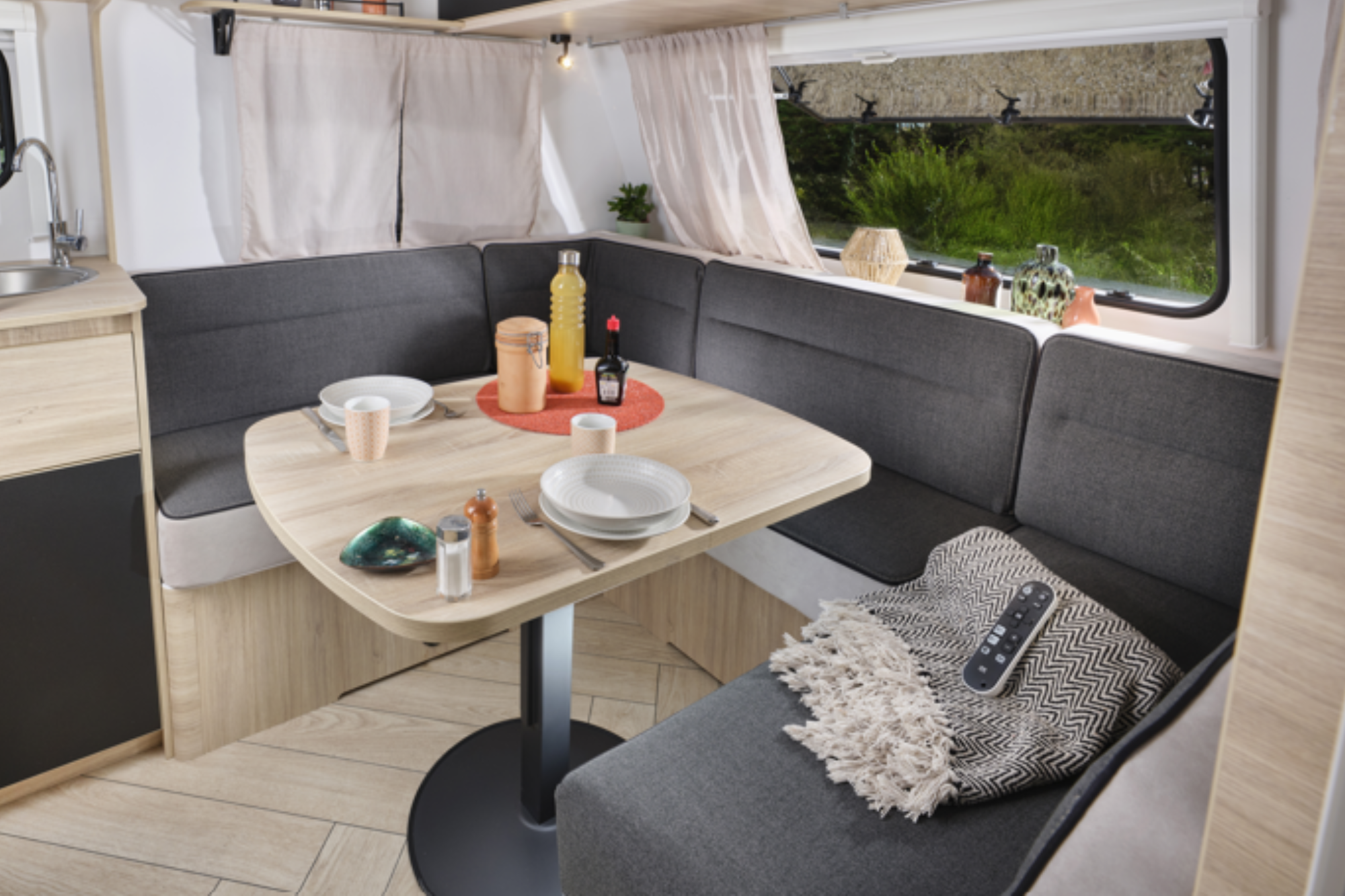 El cuarto de aseo completamente equipado ofrece todo el confort que necesitas en ruta, mientras que el comedor transformable se adapta fácilmente para convertirse en una cama adicional, perfecta para invitados o viajes en familia.